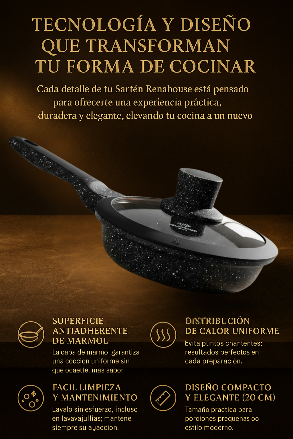 Descubre el equilibrio perfecto entre estilo, funcionalidad y durabilidad con el Sartén Renahouse Mármol Antiadherente de 20 cm. Diseñado para quienes aman cocinar con facilidad, sin complicaciones y con resultados profesionales, este sartén es tu aliado ideal para preparar desayunos, salsas, carnes o recetas rápidas sin que nada se pegue.
